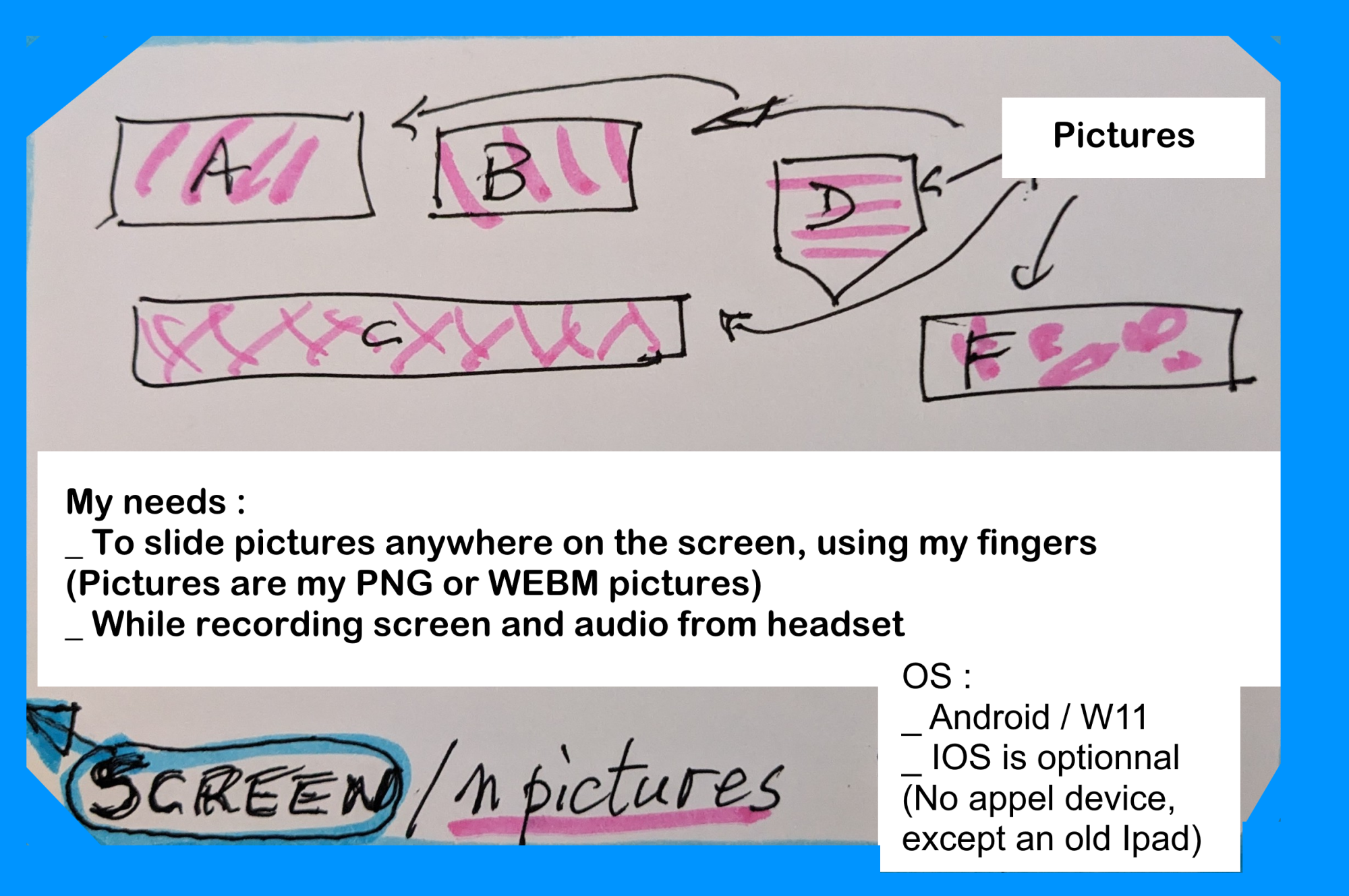 My needs seem very simple but it is not graphic design. So I'm not sure to find any application who can do this simple thing, fast , sliding pictures anywhere (While recording screen and sound)