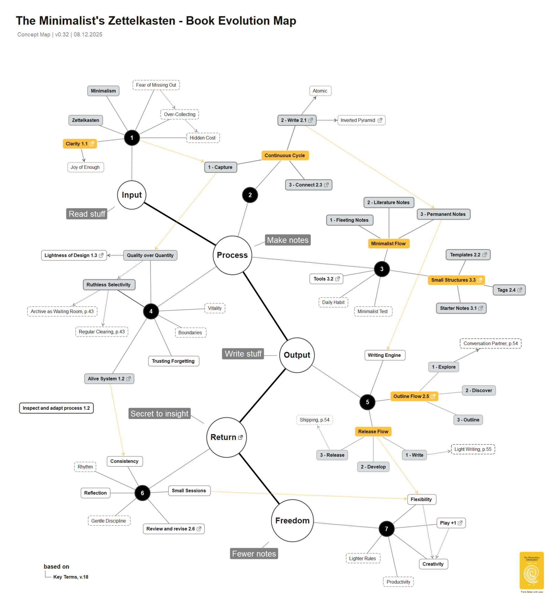 The yellow path shows the timeline of note creation dates. It took me 623 days to capture both ideas, from 'Zettelkasten (2022-03-05)' to 'Minimalism (2023-11-18)'. It took an additional 662 days to develop the book title (until 10 September 2025). My personal example of "slow thinking". ;-)