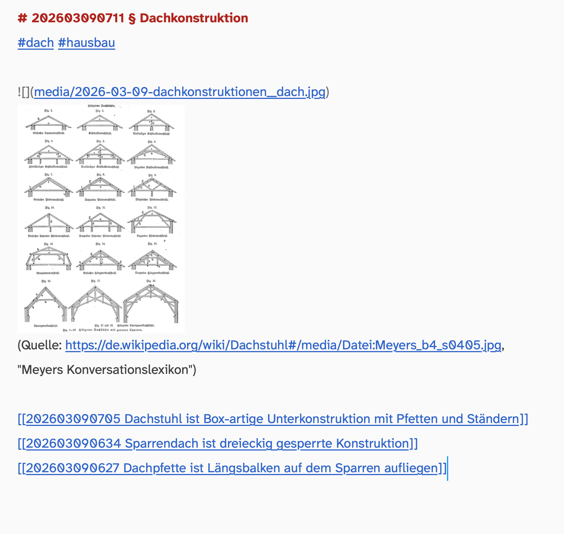Starting at the roof, I went to Wikipedia and processed a bit of vocabulary with public domain imagery. This started bottom-up, i.e. I noticed that I didn't understand a term again and then went to change that and learn a bit about these things. 30min later I figured I might as well create an overview note for the topic of "roofing", which is sparse if you're a domain expert, but shows much more than I knew before about constructing roofs.