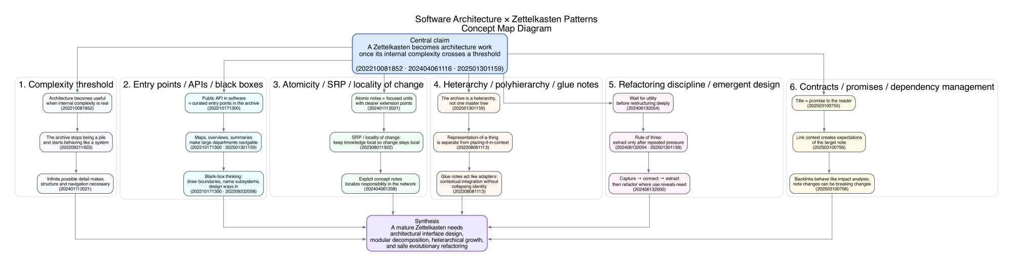 deep research my zettelkasten for connections of software architectute and Zettelkasten patterns❯ deep research my zettelkasten for connections of software architectute and Zettelkasten patterns ⏺ Skill(ta-deep-research) ⎿ Successfully loaded skill ⏺ Bash(ta --help 2>&1 | head -50) ⎿ OVERVIEW: Zettelkasten retrieval CLI for coding agents. EXAMPLES: … +25 lines (ctrl+o to expand) ⏺ Bash(ta search "software architecture" --depth 1 2>&1 | head -100) ⎿ - ref: "201606161929 ReSwift doesn't impose architectural constraints. md" title: "ReSwift doesn't impose architectural constraints" … +45 lines (ctrl+o to expand) ⏺ Bash(ta search --phrase "Zettelkasten" --phrase "software" 2>&1 | head -80) ⎿ - ref: "201009241818 Introducing Notational Velocity with MultiMarkdow n support.md" title: "Introducing Notational Velocity with MultiMarkdown support" … +108 lines (ctrl+o to expand) ⏺ Bash(ta search --phrase "pattern language" --depth 1 2>&1 | head -80) ⎿ - ref: "202501301159 § Pattern Language for Zettelkasten.md" title: "§ Pattern Language for Zettelkasten" snippet: "https://notes.andymatuschak.org/z79rMNNuLrUj6R8q1CXSpDm … +120 lines (ctrl+o to expand) ⏺ Bash(ta show "202501301159 § Pattern Language for Zettelkasten.md" "202209211603 § Zettelkasten for programmers.md" "202210081852 Complexity is required in code base…) ⎿ --- ref: "202501301159 § Pattern Language for Zettelkasten.md" title: "§ Pattern Language for Zettelkasten" … +391 lines (ctrl+o to expand) ⏺ Bash(ta show "202501301159 § Pattern Language for Zettelkasten.md" 2>&1 | tail -250) ⎿ - Solution: Write your notes so that they can be composed with other n otes into new texts, making each note a movable text fragment. - Movable type made it possible to assemble pages from smaller pie … +250 lines (ctrl+o to expand) ⏺ Bash(ta show "202209211603 § Zettelkasten for programmers.md" "202210081852 Complexity is required in code bases and Zettelkasten alike.md" 2>&1) ⎿ --- ref: "202209211603 § Zettelkasten for programmers.md" title: "§ Zettelkasten for programmers" … +93 lines (ctrl+o to expand) ⏺ Bash(ta show "202404061208 Avoid implicit themes in your Zettelkasten.md" "202308011922 Locality of change in software.md" "202406132000 Structure vs Process in Zett…) ⎿ --- ref: "202404061208 Avoid implicit themes in your Zettelkasten.md" title: "Avoid implicit themes in your Zettelkasten" … +116 lines (ctrl+o to expand) ⏺ Bash(ta show "202210171300 Zettelkasten as API needs entry points.md" "202111291403 Gall's Law working systems always start simple.md" "202403141330 Zettelkasten tra…) ⎿ --- ref: "202210171300 Zettelkasten as API needs entry points.md" title: "Zettelkasten as API needs entry points" … +51 lines (ctrl+o to expand) ⏺ Software architecture ↔ Zettelkasten in your archive Your thinking on this maps cleanly to four themes, all orbiting one big synthesis note. 1. Christopher Alexander is the explicit bridge. The centerpiece is a deliberately-constructed pattern language: - 202501301159 § Pattern Language for Zettelkasten.md — your largest §-note on the topic. Quotes Alexander 1977, organizes Zettelkasten patterns largest-to-smallest (Zettelkasten → Departments → Structures → Notes → Content → Language → Technology), and lifts pattern names straight from software: "Single Responsibility, Separated Concerns", "Boy Scout Rule", "Immutable Storage", "Rule of Three", "Algorithmic Solutions", "Signal vs Noise Ratio". - 202503090539 Cockburns medical pattern language metaphor components.md — Cockburn's Patterns of Project Management as another import of Alexander's grammar. 2. Software antipatterns port to Zettelkasten antipatterns. - 202404061208 Avoid implicit themes in your Zettelkasten.md — explicitly maps the "incidental data structure" programming antipattern onto your Zettelkasten; proposes "Concept-Free Note-Taking" by analogy to Concept-Free Programming. Heuristic: lack of an address is an indicator the idea isn't expressed directly. - 202308011922 Locality of change in software.md → reused as the structural basis for "Single Responsibility, Separated Concerns" in the pattern-language note. SRP is about change, not essence; atomicity of a Zettel is the knowledge-system analogue. 3. Structure/Process as a unifying principle across both. - 202209232058 Struktur und Prozess von Strukturen und Prozessen in der Programmierung.md — treats Structure×Process as a cross-product applicable to code (static/runtime, module boundaries shifting over coding time) and equally to knowledge work. - 202406132000 Structure vs Process in Zettelkasten for Programmers.md — Atom/Molecule/Organism granularity (Zettel / Structure Note / Project), plus Rule-of-Three extraction before refactoring into a shared theme. - 202111291403 Gall's Law working systems always start simple.md — complexity evolves from a simple working seed, applied to both codebases and Zettelkästen. 4. Zettelkasten as black-box software system. - 202210171300 Zettelkasten as API needs entry points.md — departments are black boxes; structure notes are published API; readers (future-you) interact through curated entry points. - 202209211603 § Zettelkasten for programmers.md — the programmer-facing hub. Ties it together: "Tame complexity like a programmer … Make implicit structures visible with structure notes, similar to extracting a service object." - 202210081852 Complexity is required in code bases and Zettelkasten alike.md — the one-liner version: you don't see benefits of a software architecture before the complexity crosses a threshold — same for a Zettelkasten. The connecting thread visible in the bodies: you treat the Zettelkasten as a long-lived software system. Alexander's pattern grammar (Context/Problem/Forces/Solution/Related) gives the shared formal vocabulary, and programming principles port because both must scale complexity sustainably: SRP ⇢ atomicity, loca